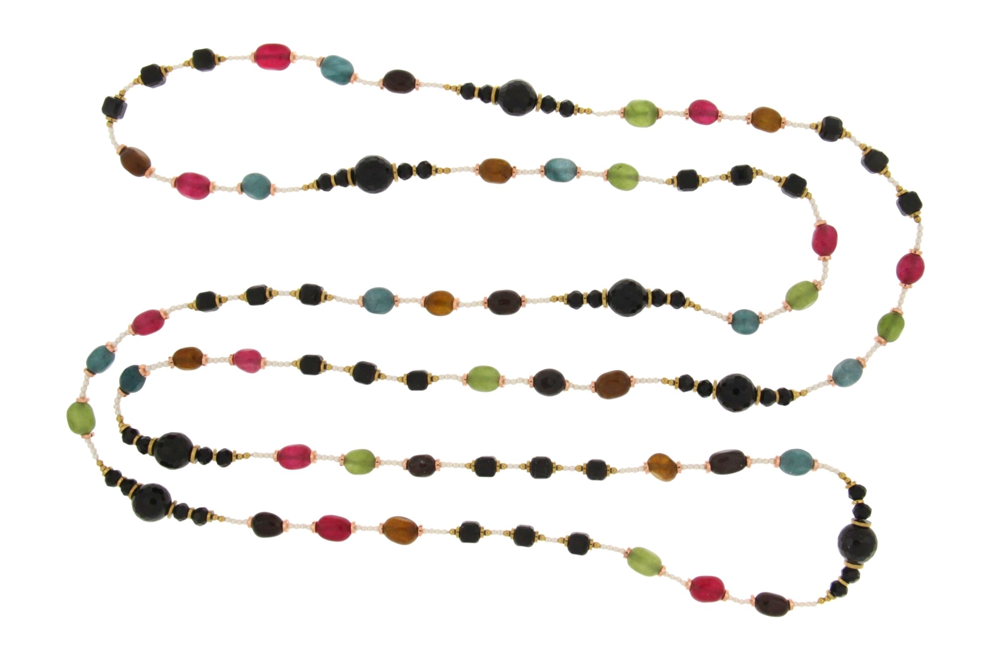 COLLANA IN QUARZO, AGATA NERA E PERLIZZATO. QUARZO RINFORZATO, TUMBLE LISCIO DI 7x10MM.TORMALINA, QUBO, 6x6MM. AGATA NERA, SFERA 12MM. PERLIZZATO, SFERA LISCIA 2MM. INSERTI IN EMATITE, RONDELLE IN COLORE ORO E ROSE’, 1x4MM E SFERA LISCIA 2MM. LUNGHEZZA COLLANA 160CM.